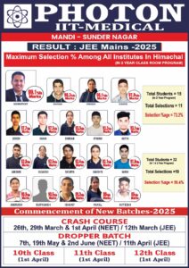आईआईटी धनवाद से बीटेक व एमटैक की डिग्री हासिल करने वाले संस्थान के निदेशक आदर्श त्रिपाठी ने बताया कि फोटॉन संस्थान के छात्रों ने विगत वर्ष की तरह ही इस वर्ष भी उकृष्ट परिणाम हासिल किया है और अपनी क्षमताओं को साबित कर फोटॉन संस्थान सहित हिमाचल प्रदेश का नाम रोशन किया है। साथ ही उन्होंने इस उपलब्धि के लिए अभिभावकों तथा सभी अध्यापकों को इस उपलब्धि की बधाई दी है। उन्होंने बताया कि फोटॉन आईआईटी मेडिकल संस्थान हिमाचल प्रदेश का एक मात्र ऐसा संस्थान जिसका प्रबंधन व शिक्षण देश के विभिन्न आईआईटी से शिक्षा प्राप्त शिक्षक विद्यार्थियों को पढ़ा रहे है। मंडी में शिक्षा के क्षेत्र में अग्रणी फोटॉन आईआईटी मेडीकल संस्थान मंडी बच्चों को उच्च गुणवत्ता युक्त शिक्षा प्रदान कर रहा है।