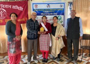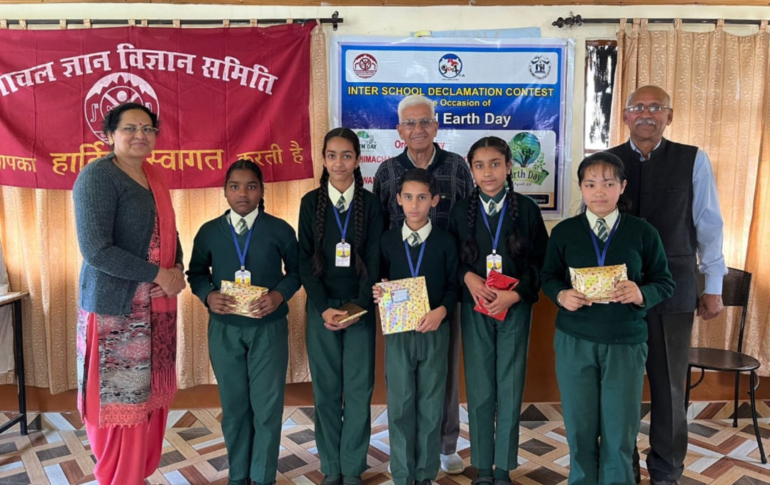 सोलन। ज्ञान विज्ञान समिति की सोलन जिला इकाई ने पंवार इंस्टीट्यूट के सभागार में पृथ्वी दिवस पर भाषण प्रतियोगिता का आयोजन किया। प्रतियोगिता में सोलन व आसपास के स्कूलों कें बच्चों ने हिंदी व अंग्रेजी भाषा वर्ग की भाषण प्रतियोगिता में हिस्सा लिया। अंग्रेजी में सोलन गर्ल्स स्कूल की स्वास्तिका व हिंदी वर्ग में सीसे स्कूल शमरोड की सिमरन ने पहला स्थान प्राप्त किया।